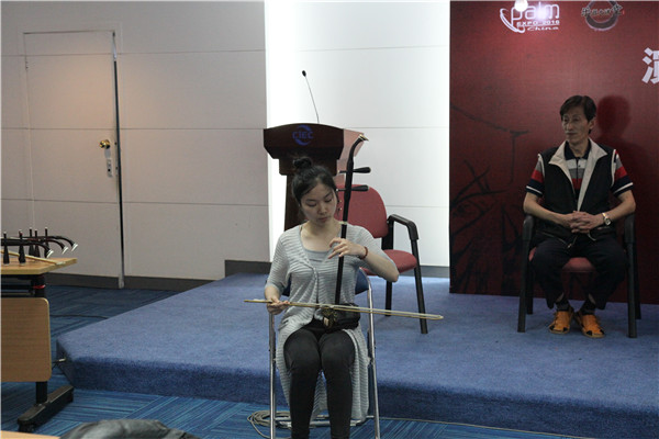 觀眾提問環(huán)節(jié),互動(dòng)踴躍。二胡研究者黃顯海先生還展示了他研制的人工蟒皮二胡,得到了專家的贊譽(yù)。